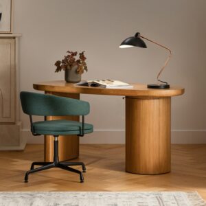 A simple form that’s more than the sum of its parts, the Adel desk is boldly sculptural. With solid wood edges, retro recessed circular pulls, and two spacious drawers for storage, the Adel desk helps you get your work done in style. The Adel’s desktop is curved, maintaining soft lines for visual ease. Its sturdy…