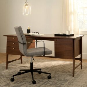Love walnut? Love mid-century design? Of course you do. Crafted from a mix of solid and durable veneer wood, the Krossa Executive Desk isn’t the kind to crave attention—but it will get some anyway. Especially since its three drawers and additional cabinet bring executive-style organization to your workflow. Use it to prepare your papers, get…