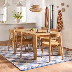 The traditional trestle-style base dining table minus “traditional values.” A sturdy time-tested design, Gina is updated for the modern day dinner party needs with an extendable leaf that drops in when you need. Comfortable for up to 8 guests, you can have the whole family over — or not!