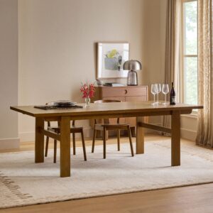 Keeping supper simple since mid-2025. The Heidi table is purposely unembellished to let its thoughtful details shine: a lip of solid-wood edging highlights the beautiful wood grain and visually separates the top and base of the table. A drop-in leaf emerges to accommodate unexpected guests, or to make more room for the fourth-grade poster art…