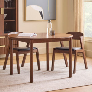 If Camelot was a design destination, the knights would have sat at an oval dining table. Share a meal with 4-6 of your favorite people (more if you don’t mind bumping elbows). This mid-century style walnut dining table is set atop solid wood legs and features a veneered starburst-style design on the top. Glamour and…